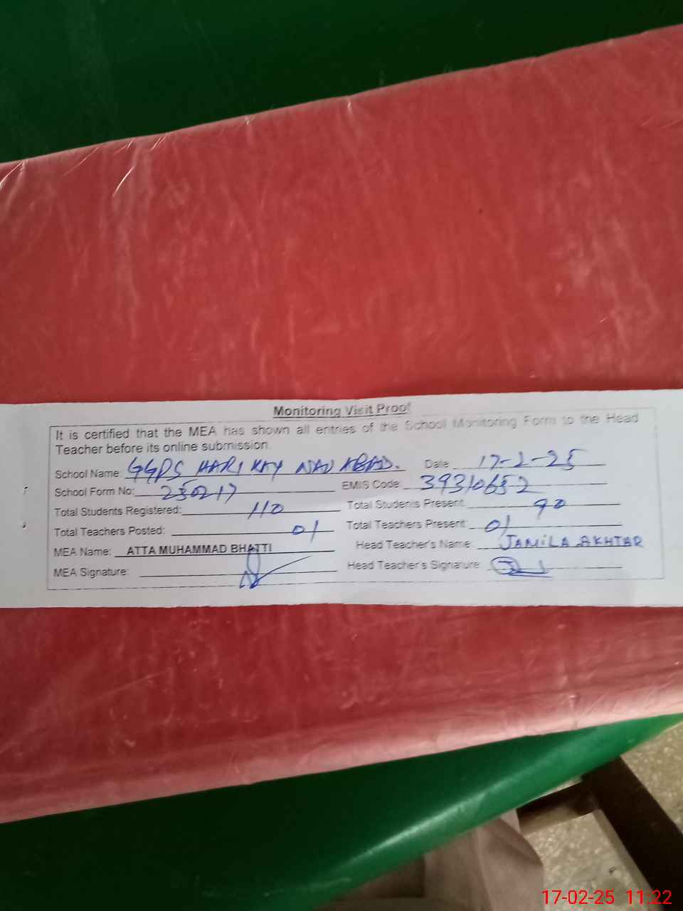 | Attendance Register | Head Teacher | MEA with School | Visit Proof |