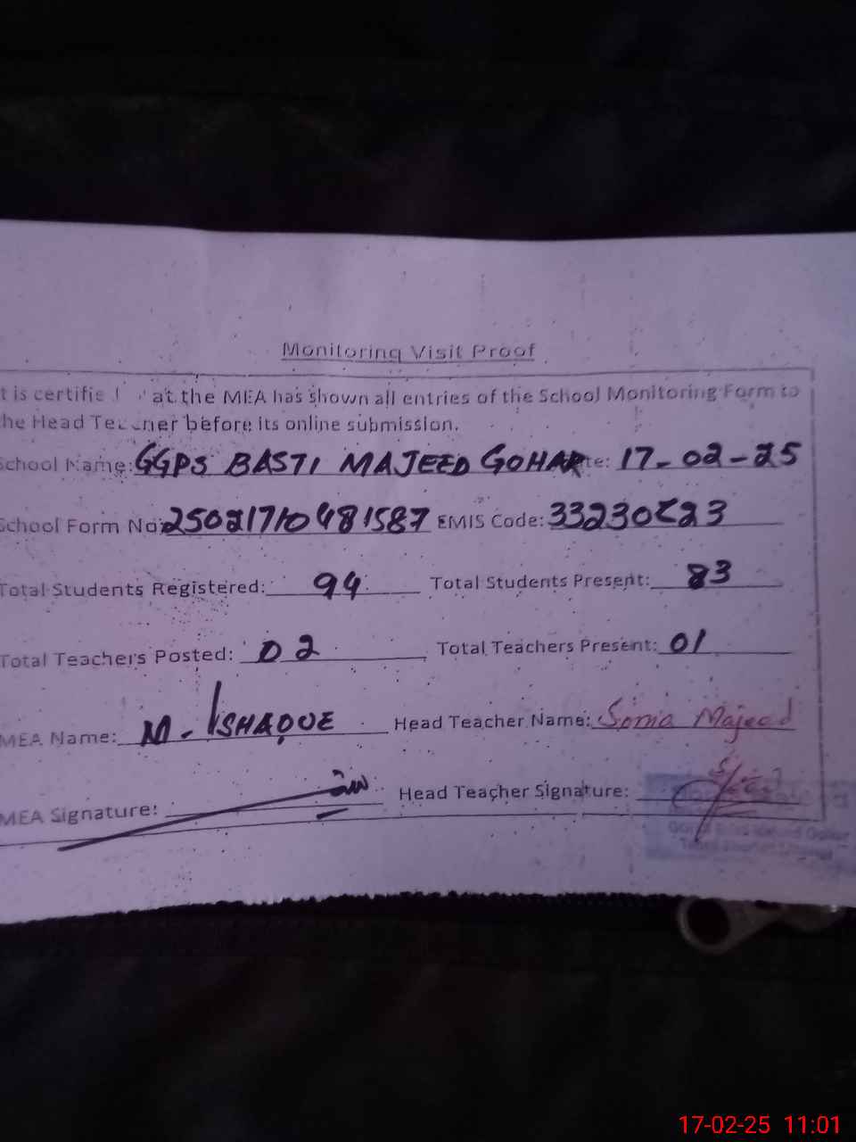 | EMIS Code: 33230623 | Name of School: GGPS BASTI MAJEED GOHAR | |||