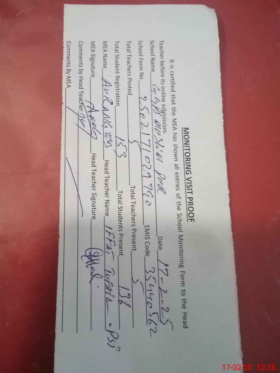 | Attendance Register | Head Teacher | MEA with School | Visit Proof |