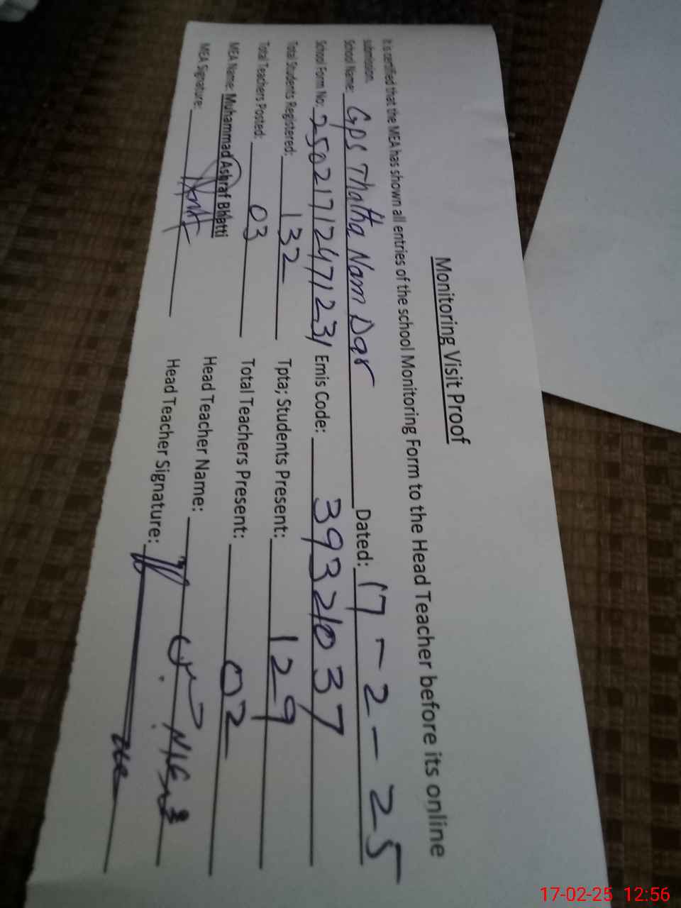 | Attendance Register | Head Teacher | MEA with School | Visit Proof |