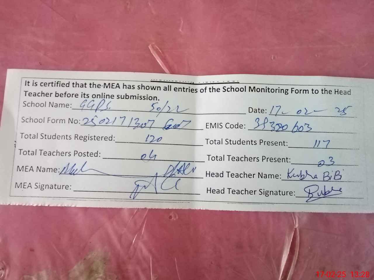 | Certified that this School was Inspected by the Undersigned MEA/DMO Today and the Information Stated Above is as Per Record. | |||||