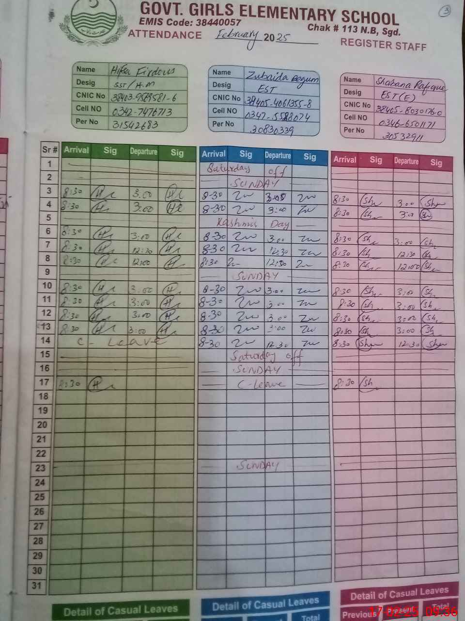 | CNIC | Full Name | Designation | R/C | Absence during last cal. month |