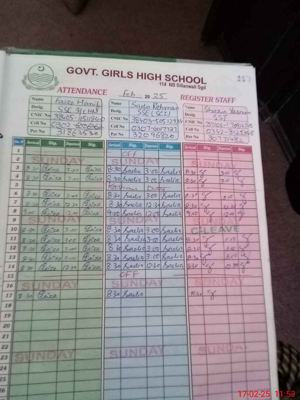 | CNIC | Full Name | Designation | R/C | Absence During Last Calender Month |