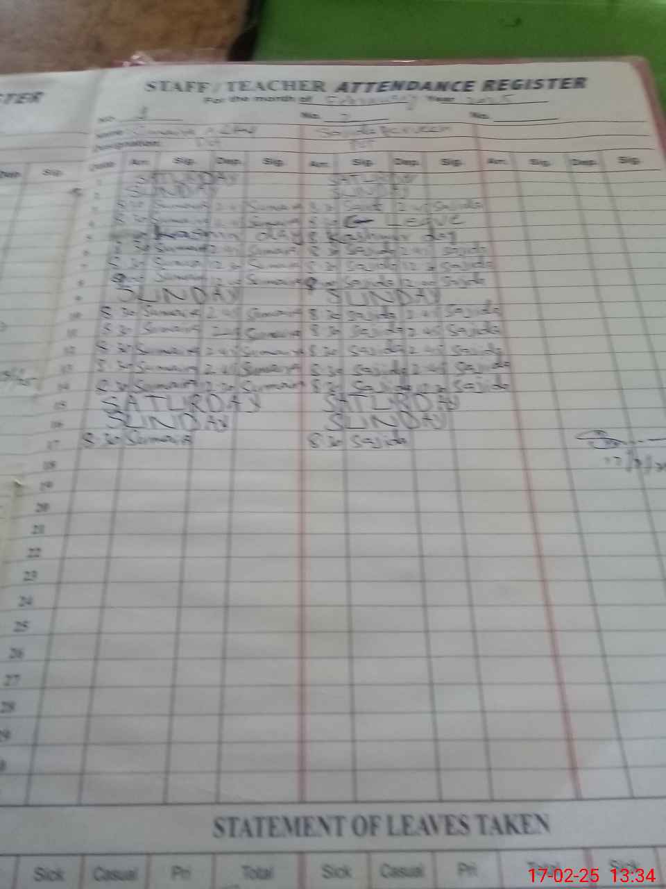 | CNIC | Full Name | Designation | R/C | Absence During Last Calender Month |