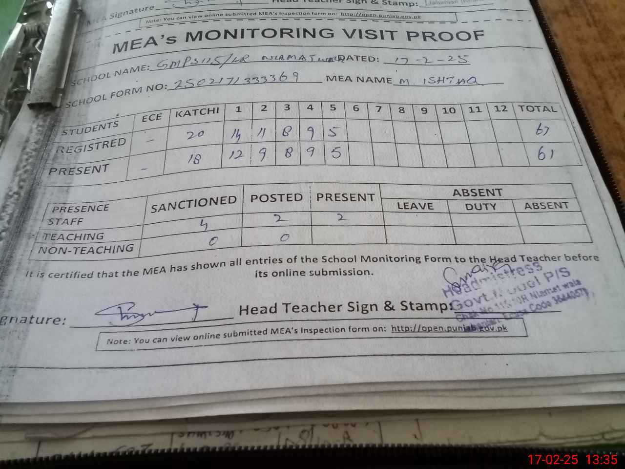 | Attendance Register | Head Teacher | MEA with School | Visit Proof |