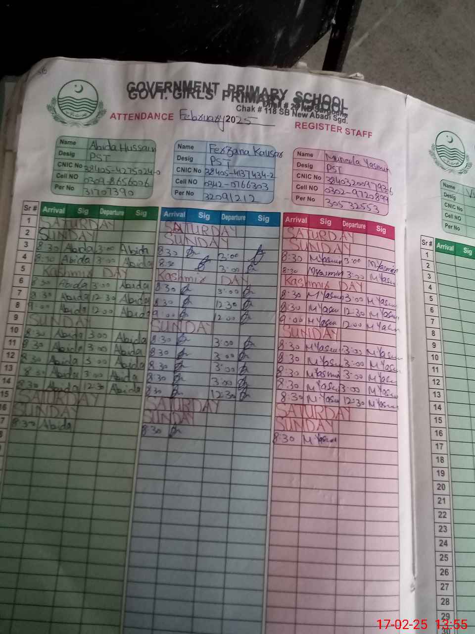 | CNIC | Full Name | Designation | R/C | Absence During Last Calender Month |