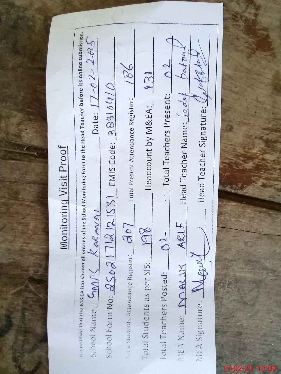 | Attendance Register | Head Teacher | MEA with School | Visit Proof |