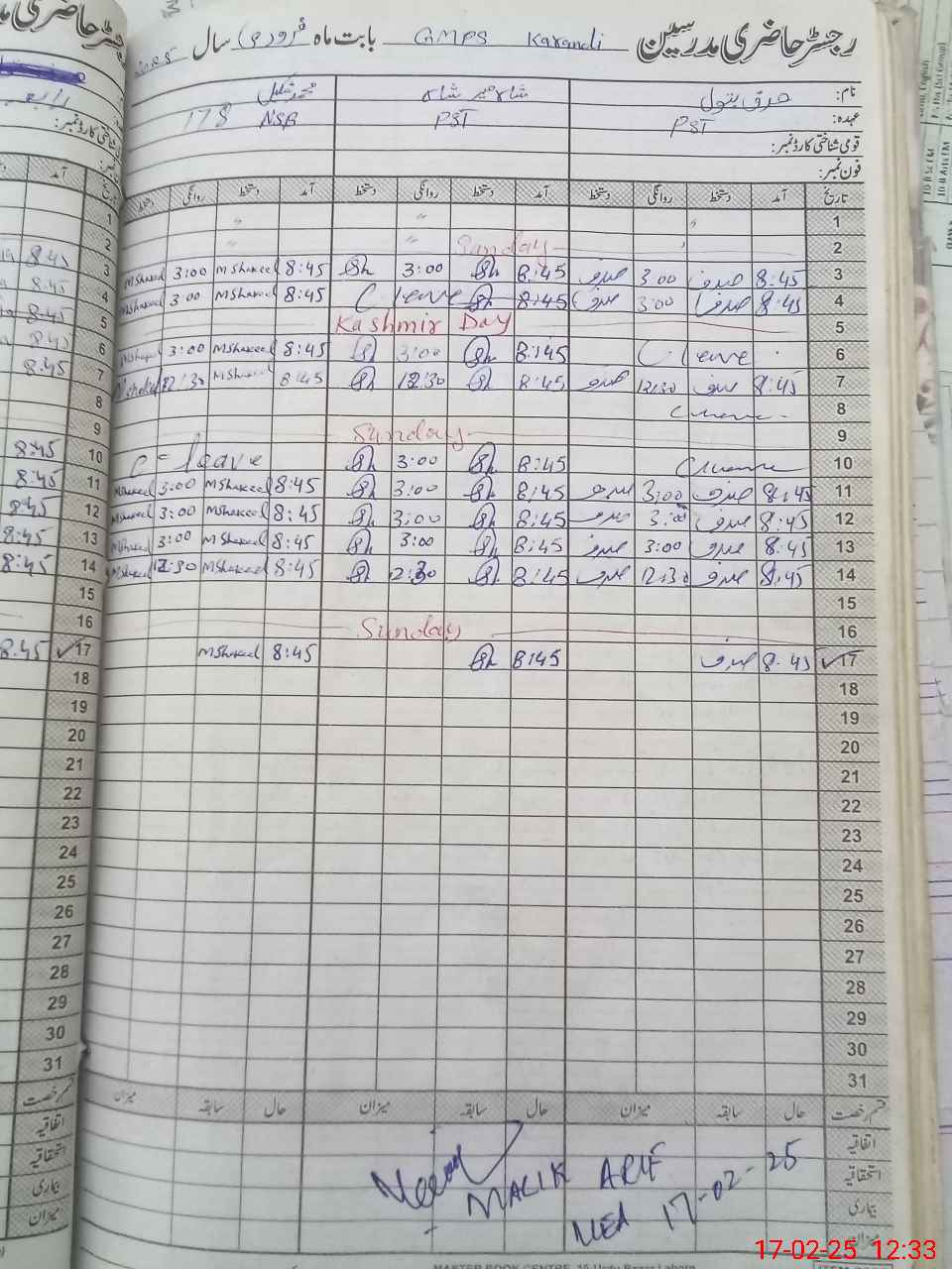 | CNIC | Full Name | Designation | R/C | Absence During Last Calender Month |