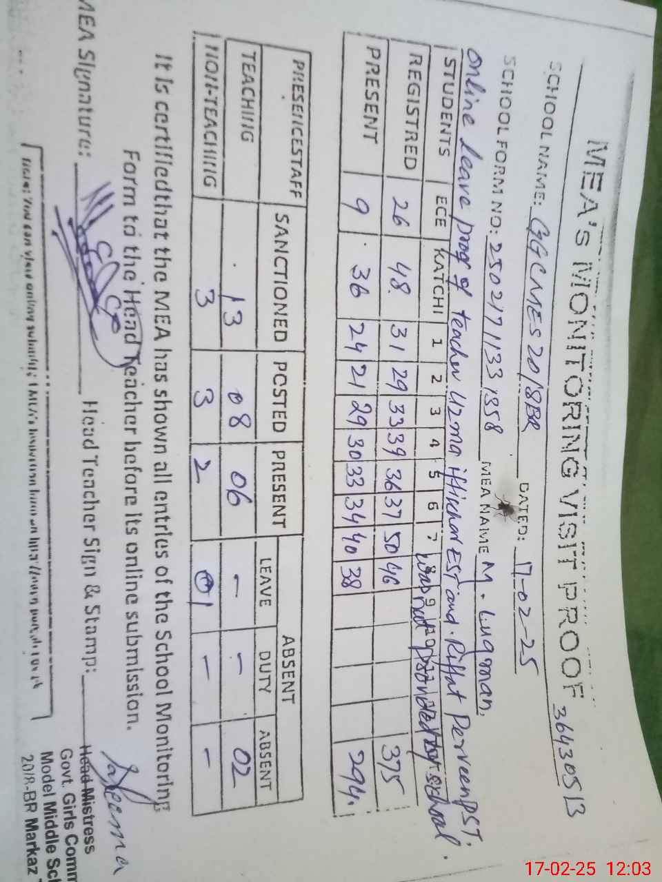 | Attendance Register | Head Teacher | MEA with School | Visit Proof |