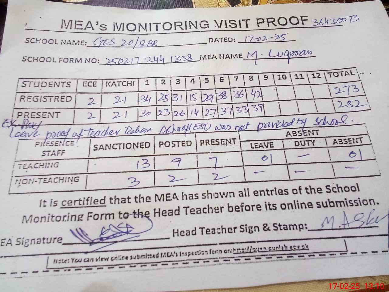 | Attendance Register | Head Teacher | MEA with School | Visit Proof |