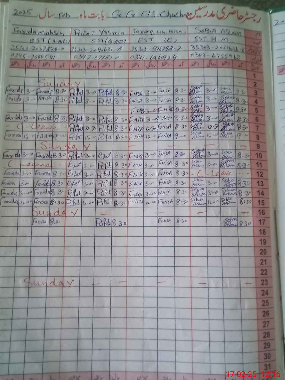 | CNIC | Full Name | Designation | R/C | Absence During Last Calender Month |