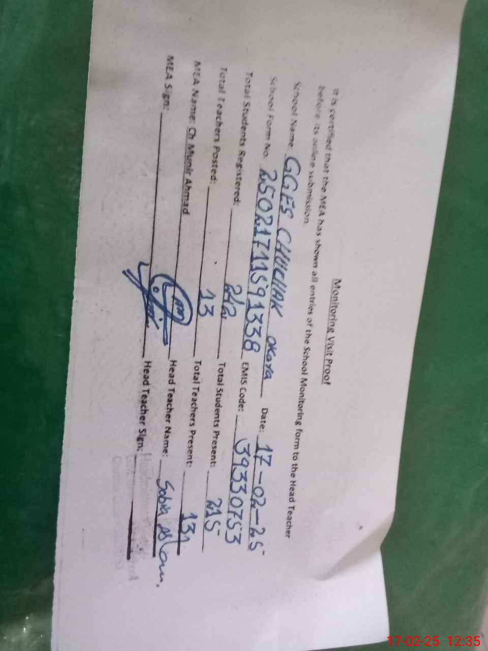 | Attendance Register | Head Teacher | MEA with School | Visit Proof |