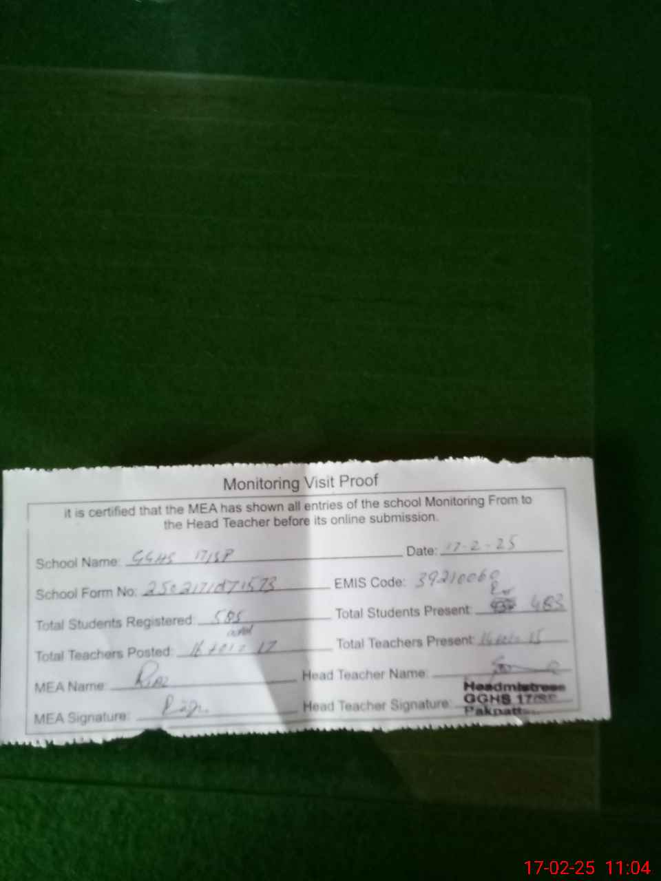 | Attendance Register | Head Teacher | MEA with School | Visit Proof |