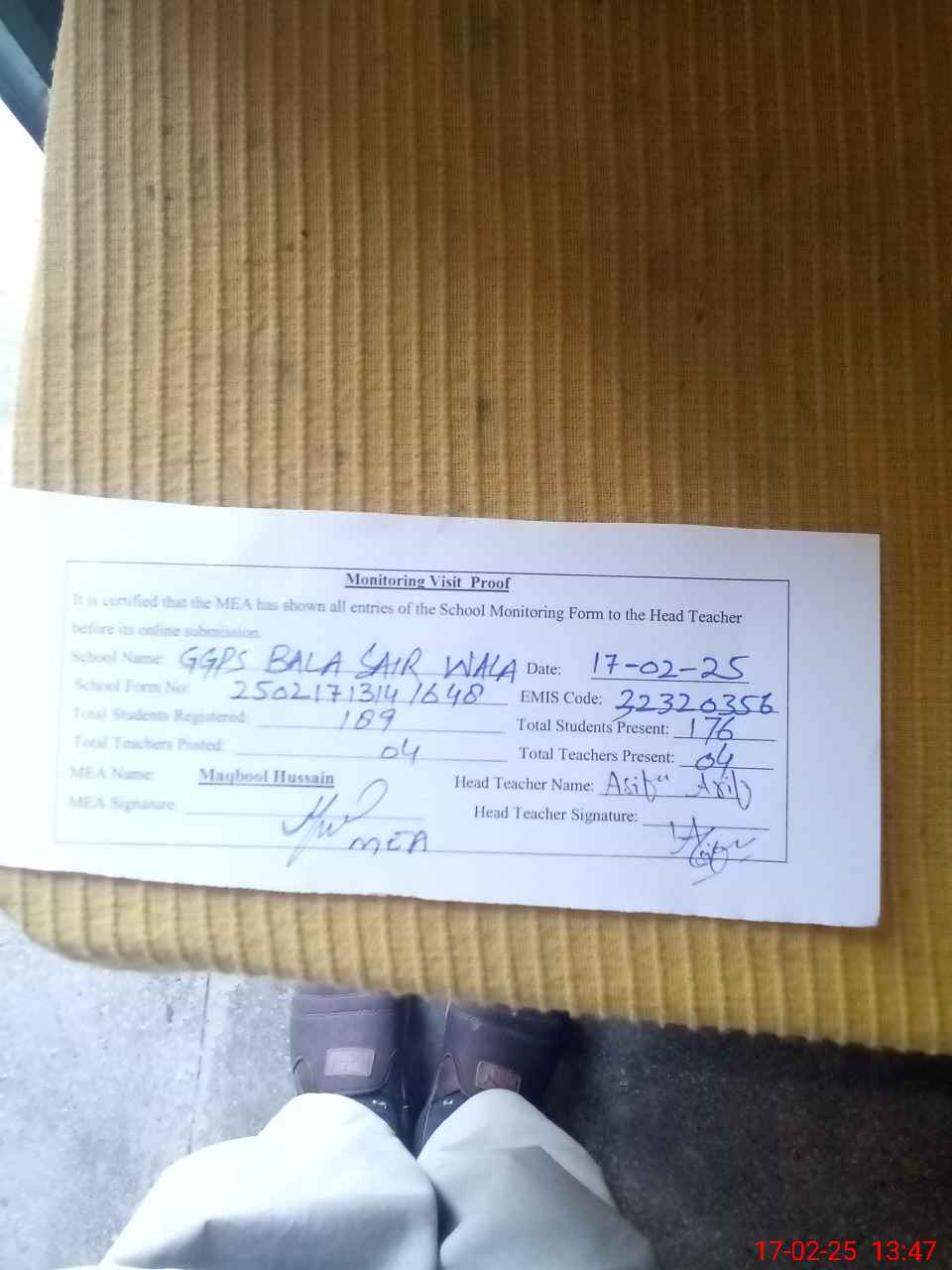 | Attendance Register | Head Teacher | MEA with School | Visit Proof |