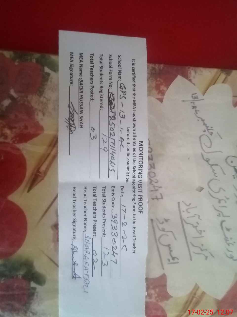 | Attendance Register | Head Teacher | MEA with School | Visit Proof |