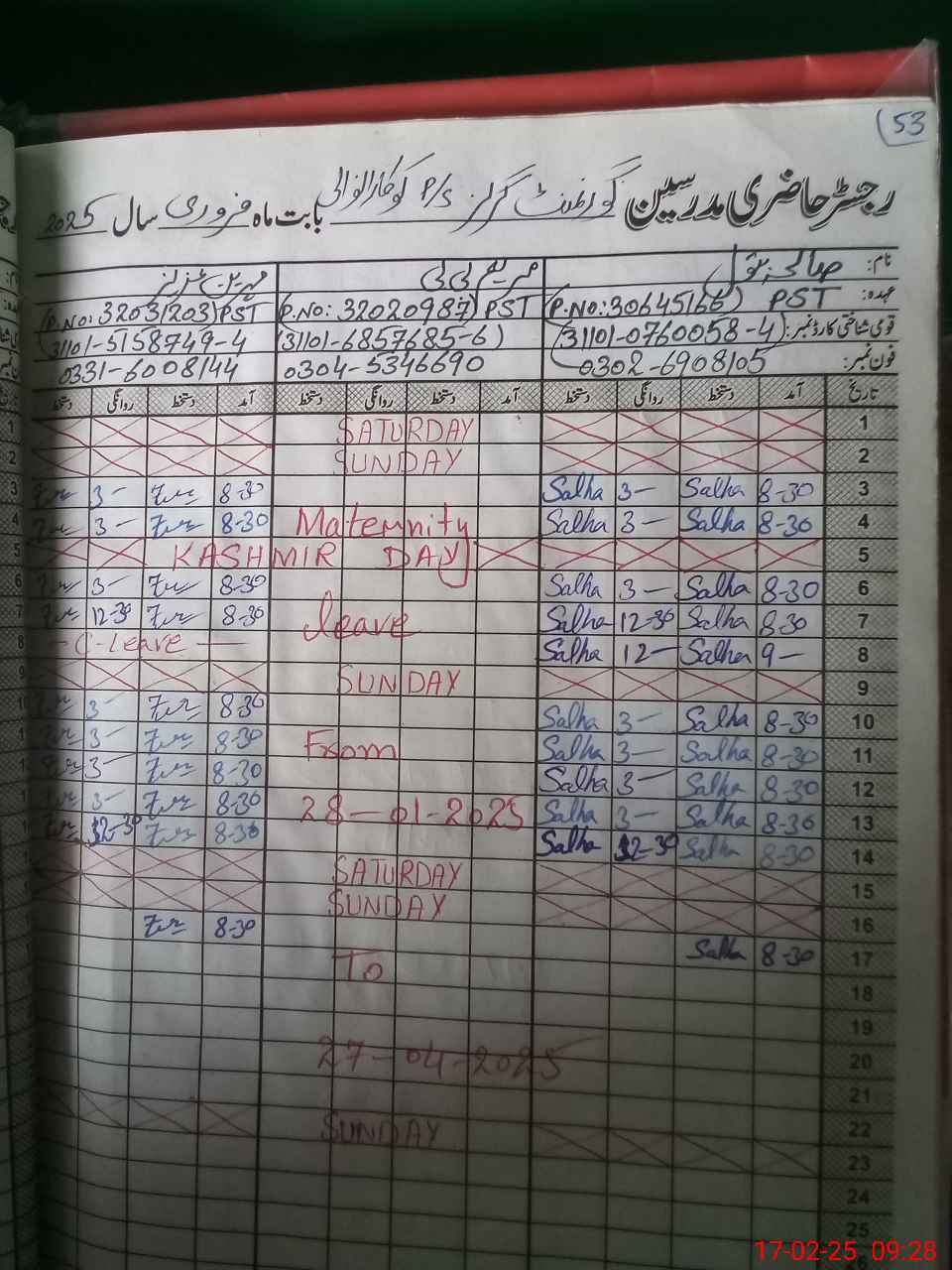 | CNIC | Full Name | Designation | R/C | Absence During Last Calender Month |