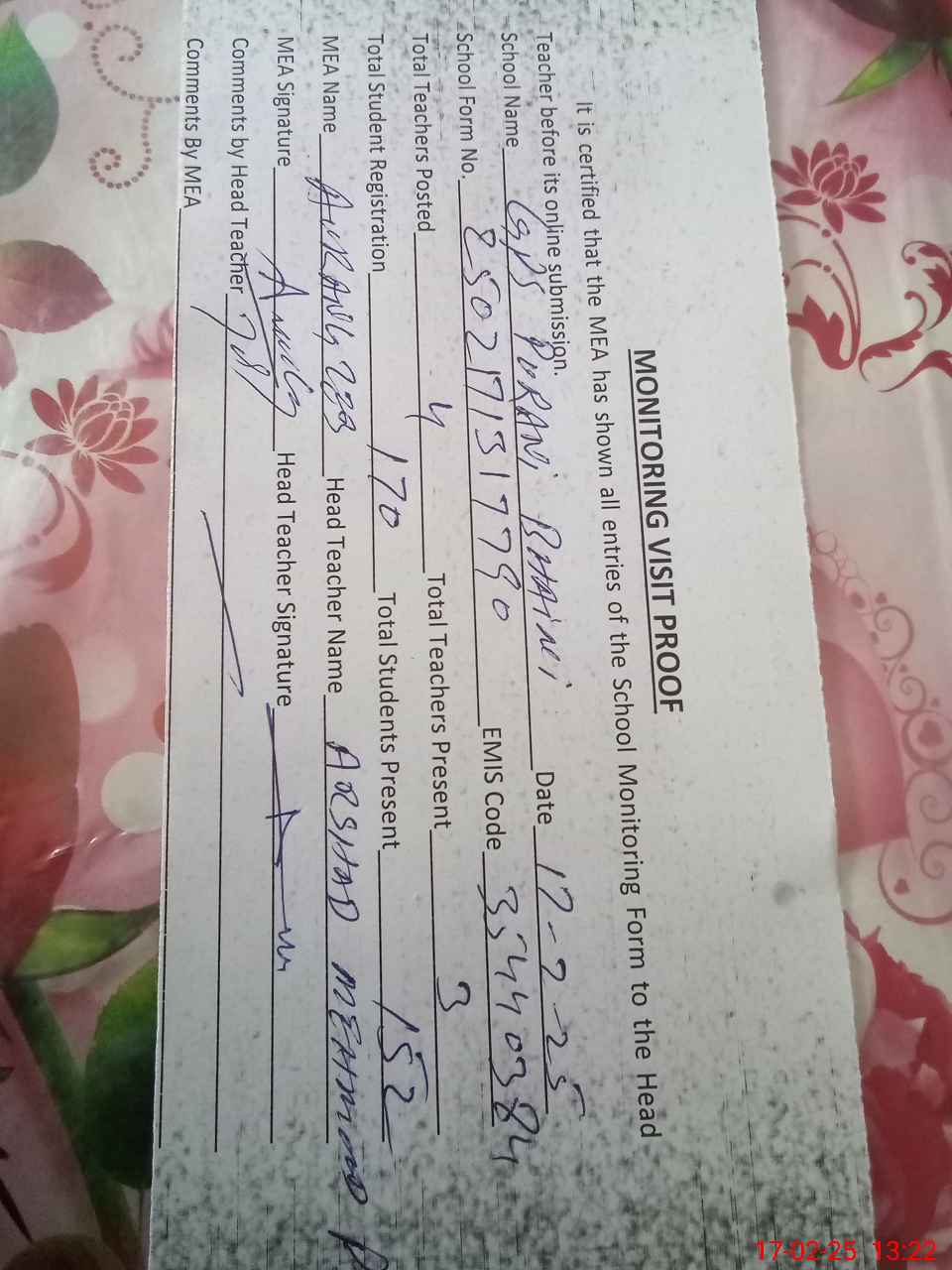 | Name: AR**** ME**** Designation: (School Headmaster's/Headmistress's) PST/PTC/JV Phone/Cell Number: 03**** |