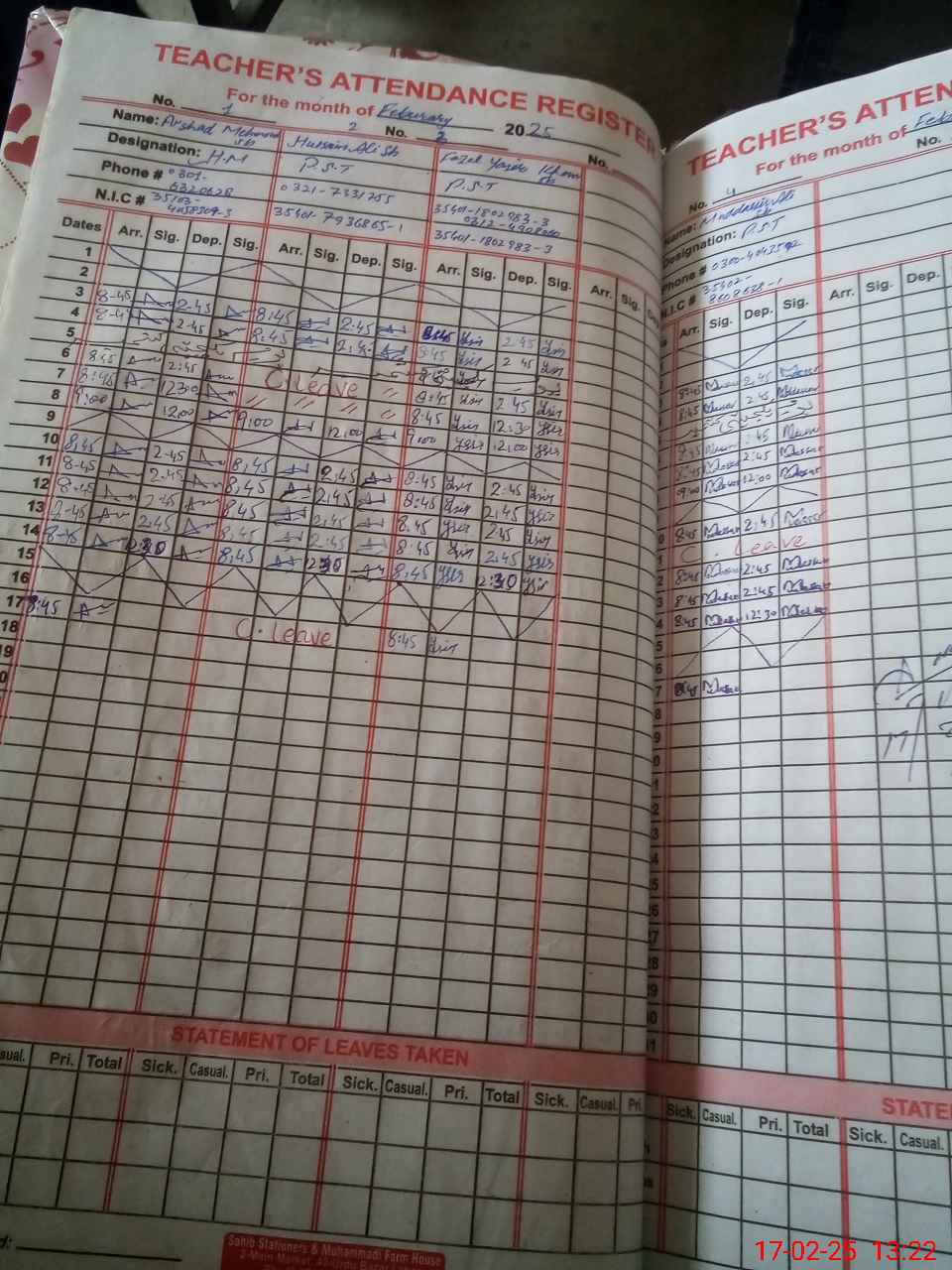 | CNIC | Full Name | Designation | R/C | Absence During Last Calender Month |