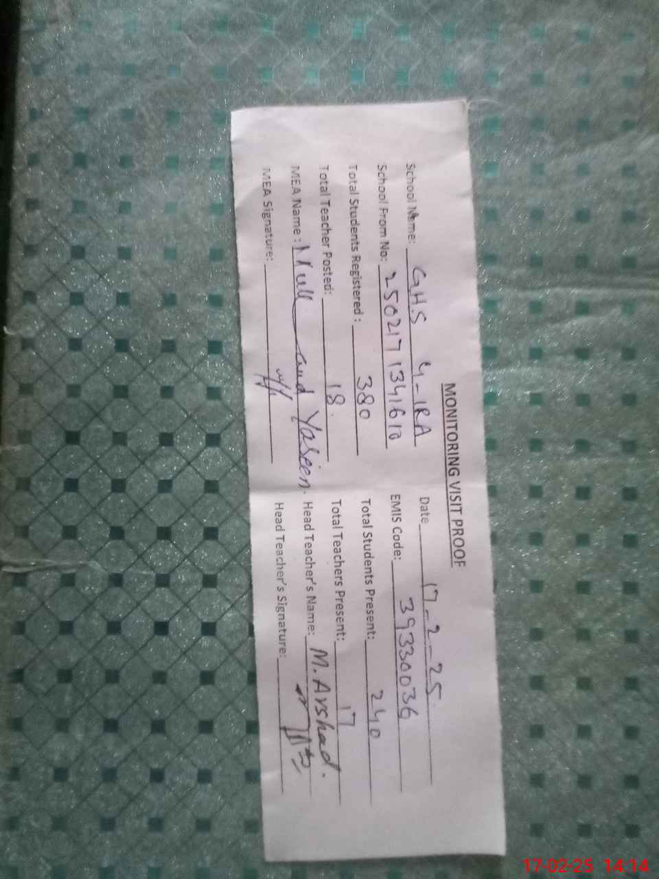 | Attendance Register | Head Teacher | MEA with School | Visit Proof |