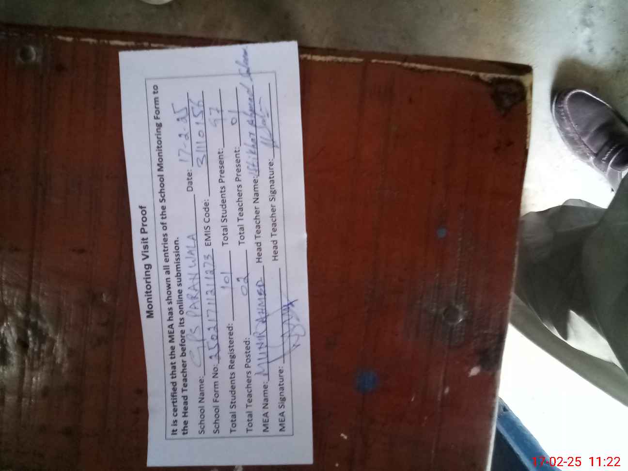 | Attendance Register | Head Teacher | MEA with School | Visit Proof |
