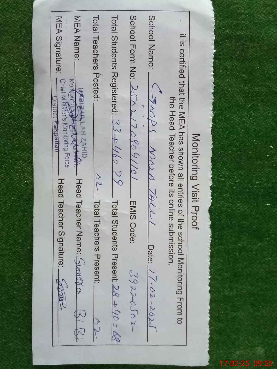 | Certified that this School was Inspected by the Undersigned MEA/DMO Today and the Information Stated Above is as Per Record. | |||||