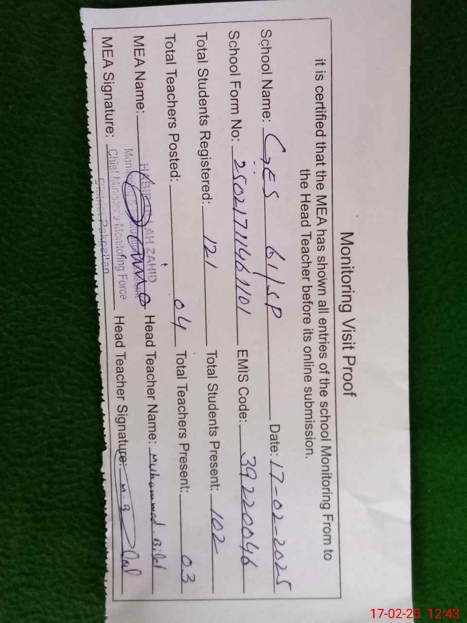 | Attendance Register | Head Teacher | MEA with School | Visit Proof |