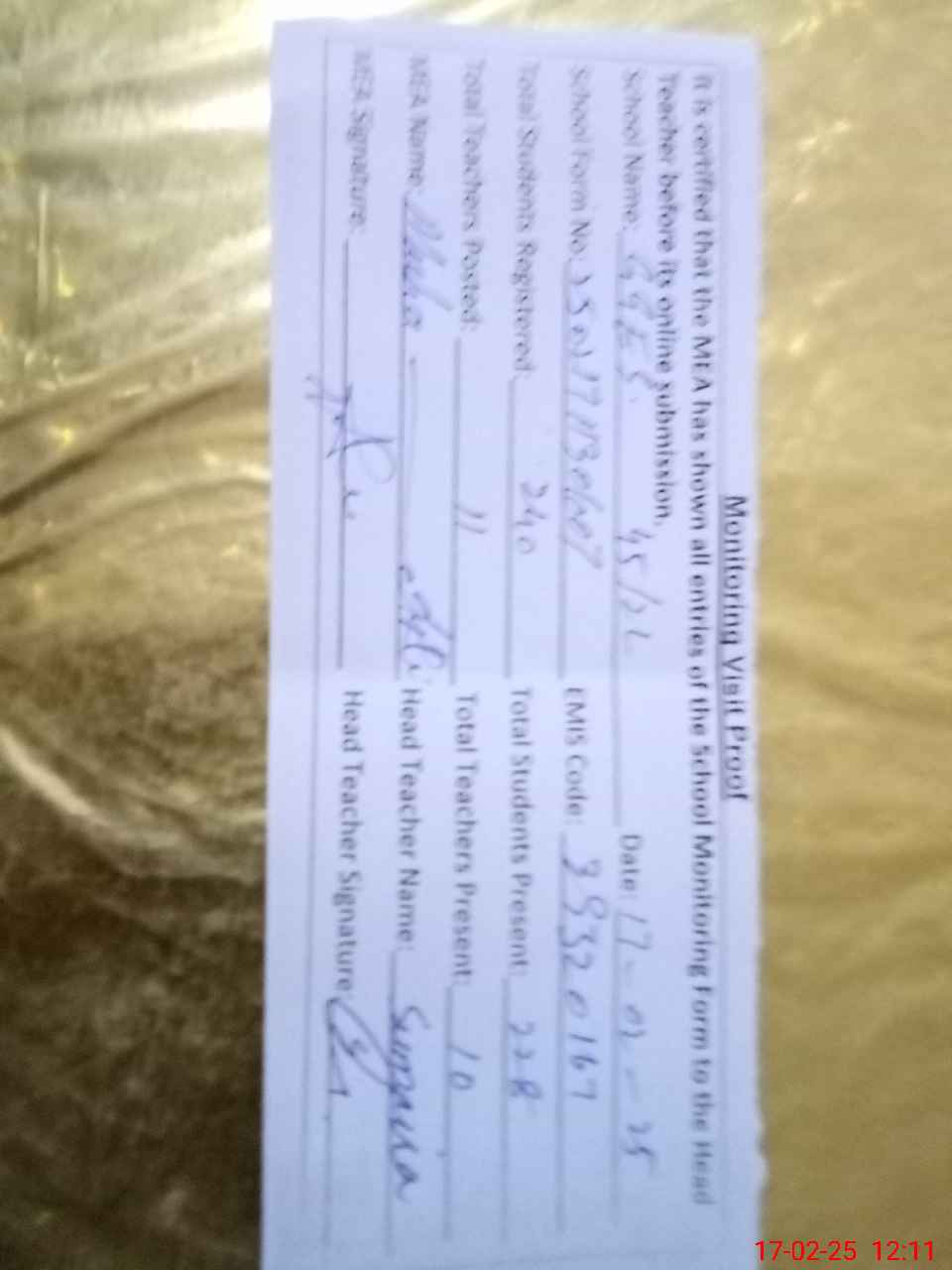 | Attendance Register | Head Teacher | MEA with School | Visit Proof |