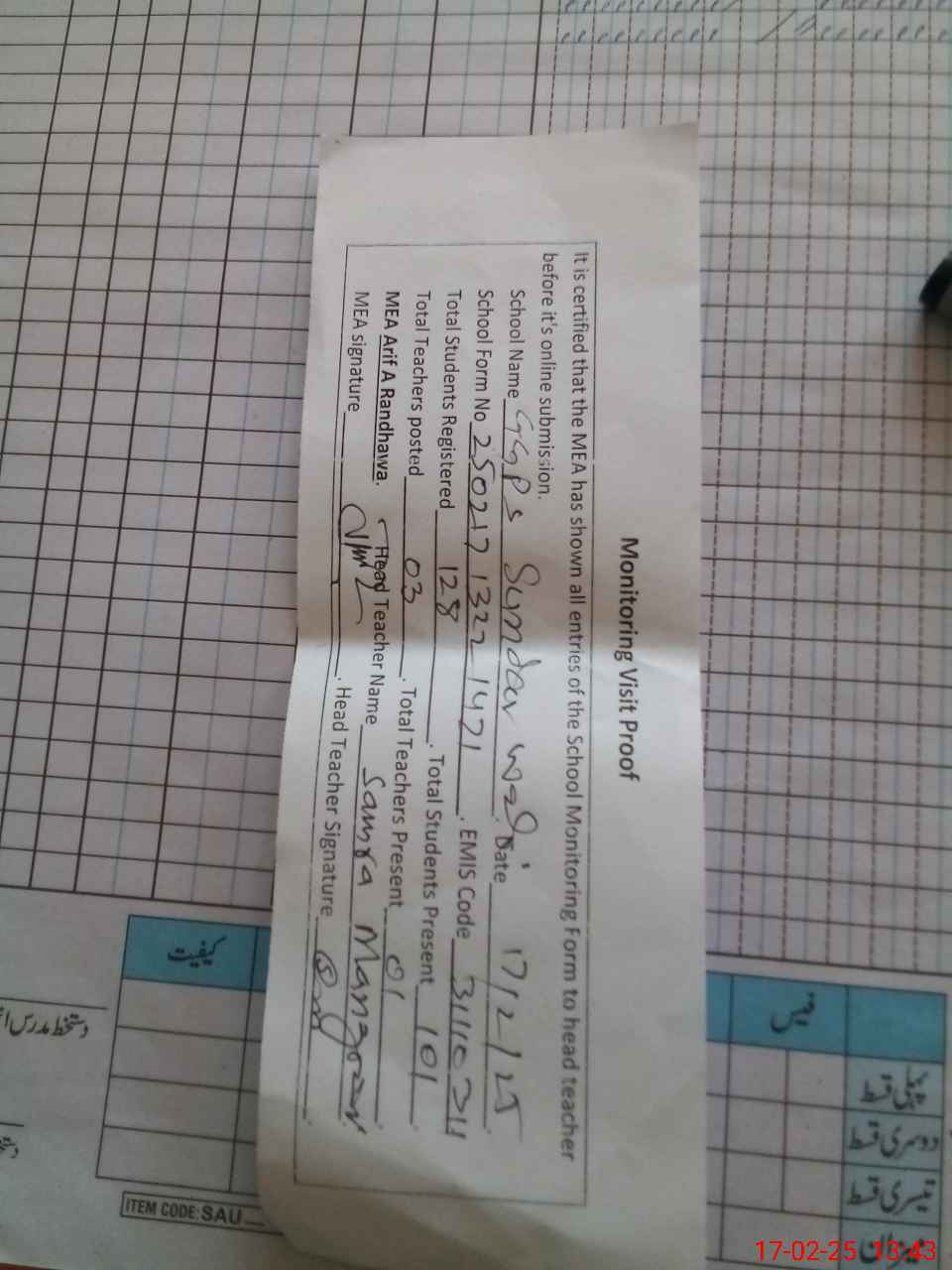 | EMIS Code: 31110311 | Name of School: GGPS SUNDAR WALI | |||