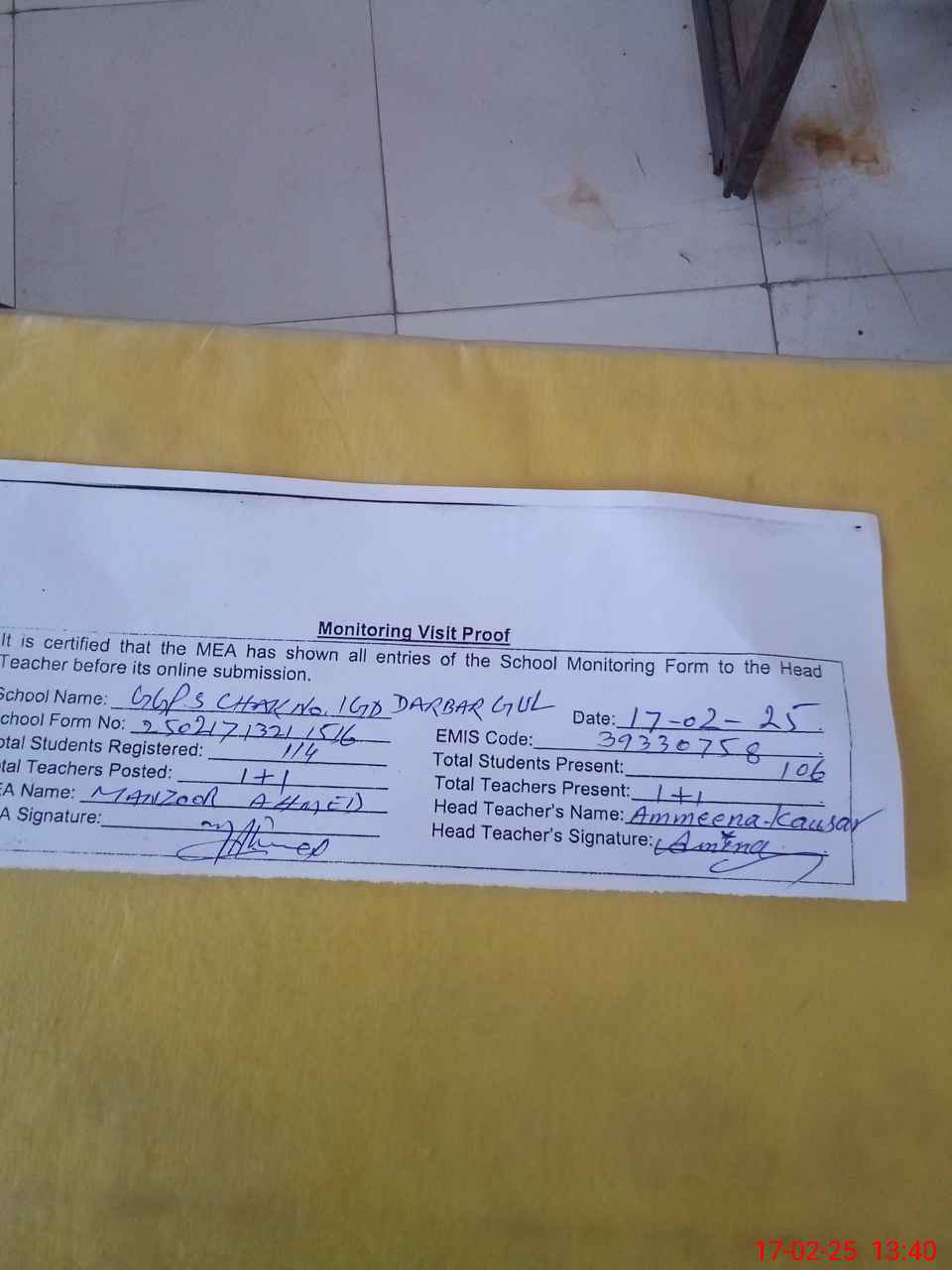 | EMIS Code: 39330758 | Name of School: GGPS CHAK NO.1/GD DARBAR GUL | |||