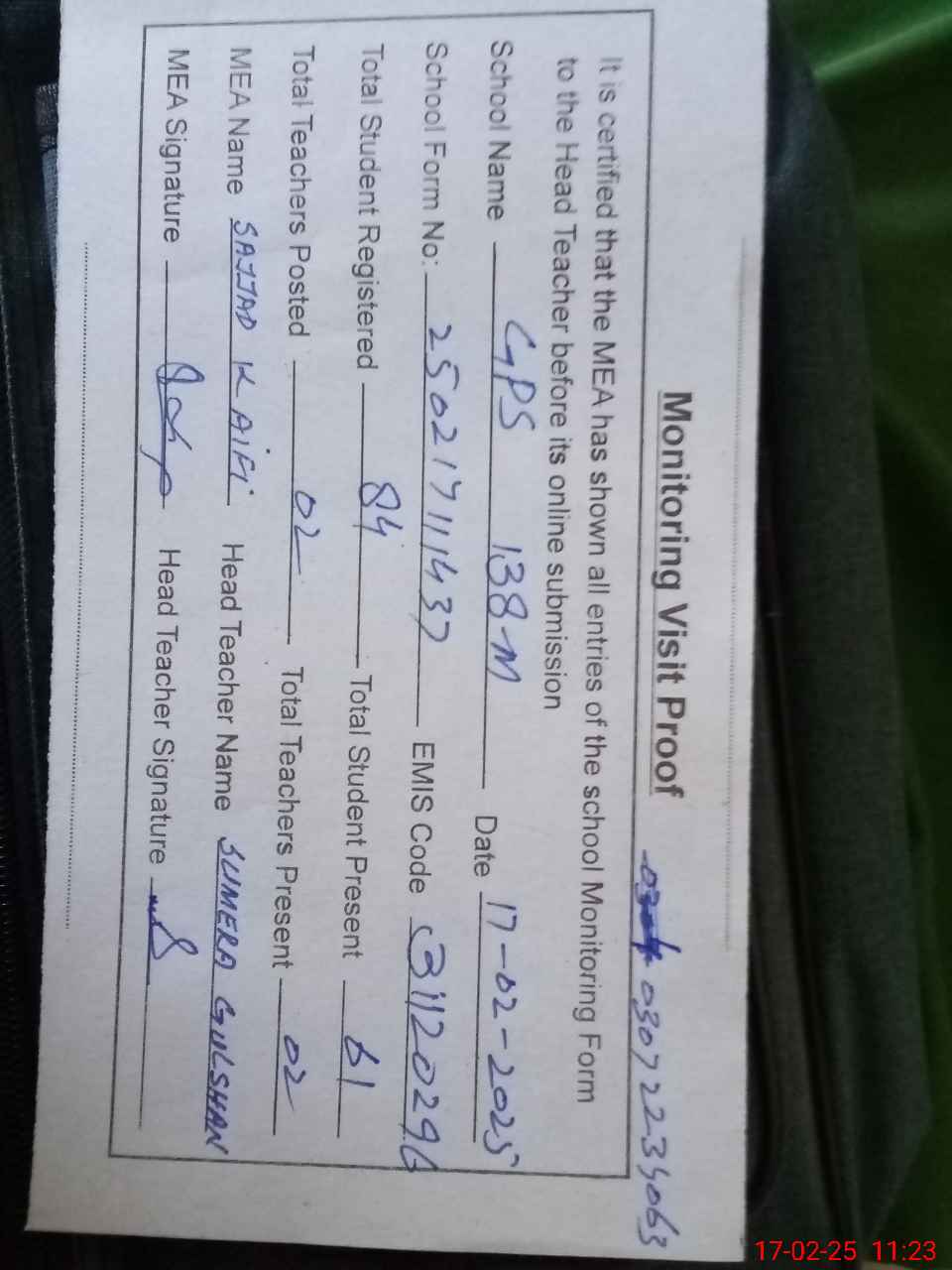| Attendance Register | Head Teacher | MEA with School | Visit Proof |