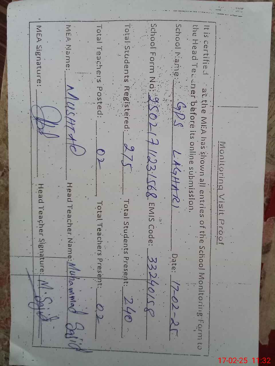 | EMIS Code: 33240158 | Name of School: GPS LAGHARI | |||