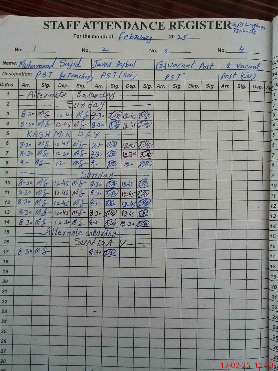 | Name: MU**** SA**** Designation: (School Headmaster's/Headmistress's) PST Phone/Cell Number: 03**** |
