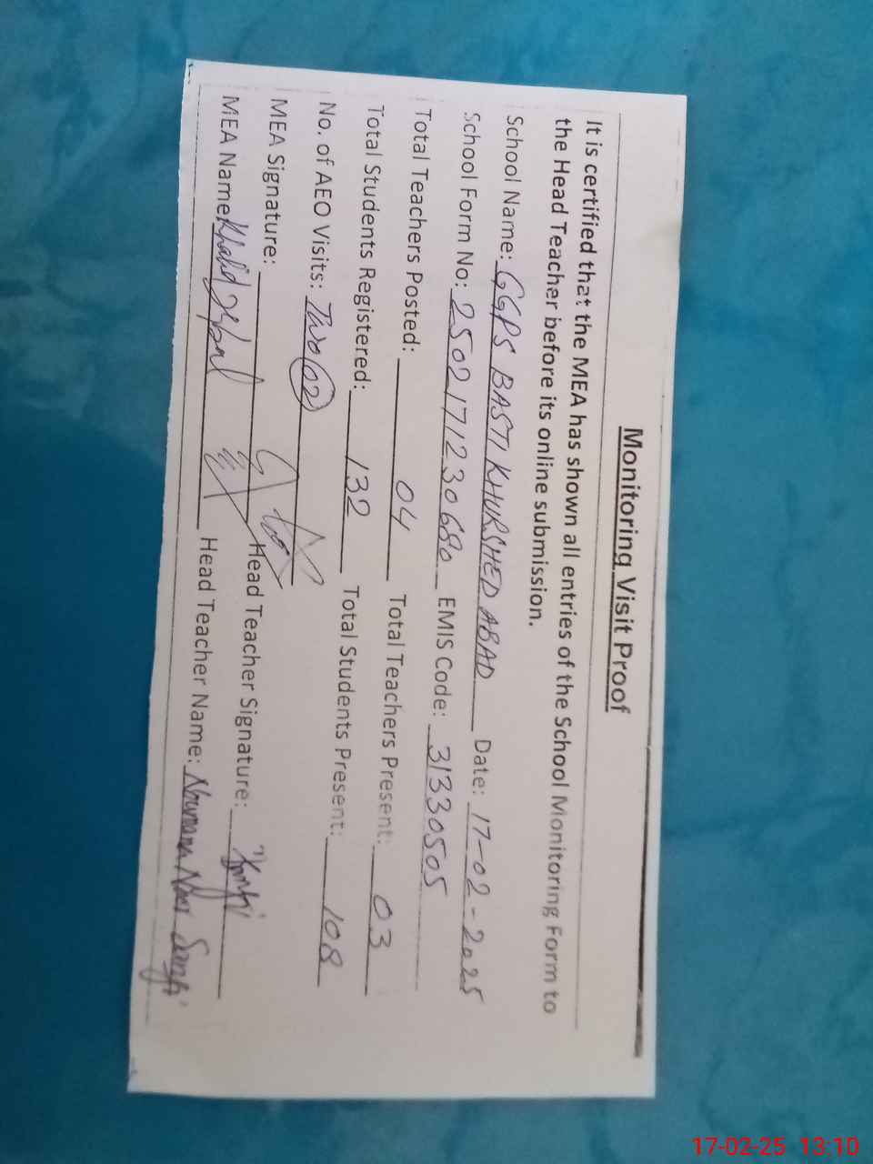 | Attendance Register | Head Teacher | MEA with School | Visit Proof |