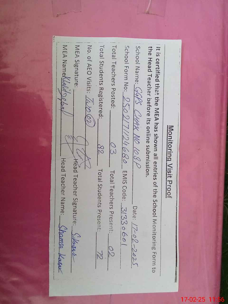 | Attendance Register | Head Teacher | MEA with School | Visit Proof |