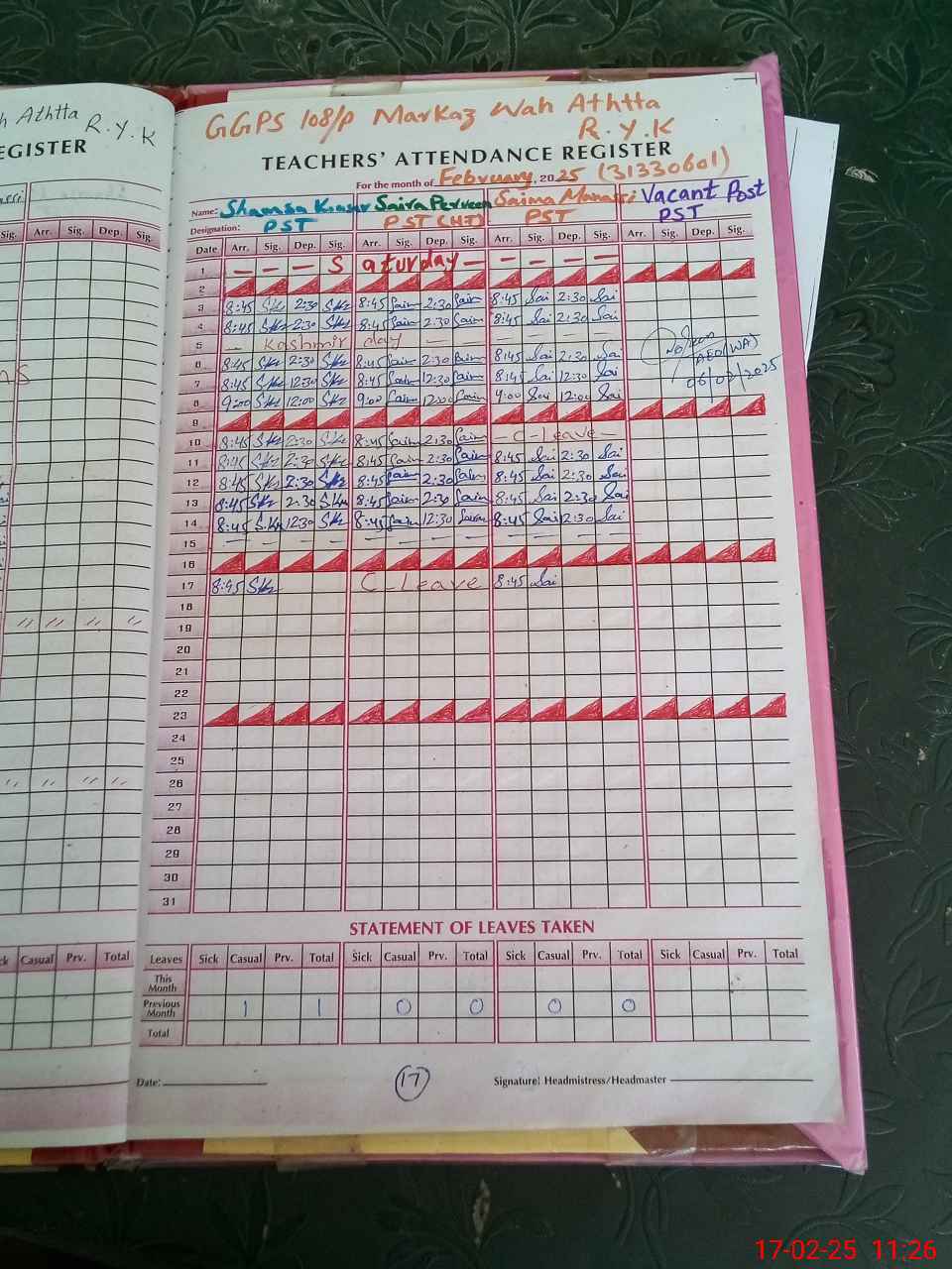 | Name: Sa**** Pa**** Designation: (School Headmaster's/Headmistress's) PST Phone/Cell Number: 03**** |