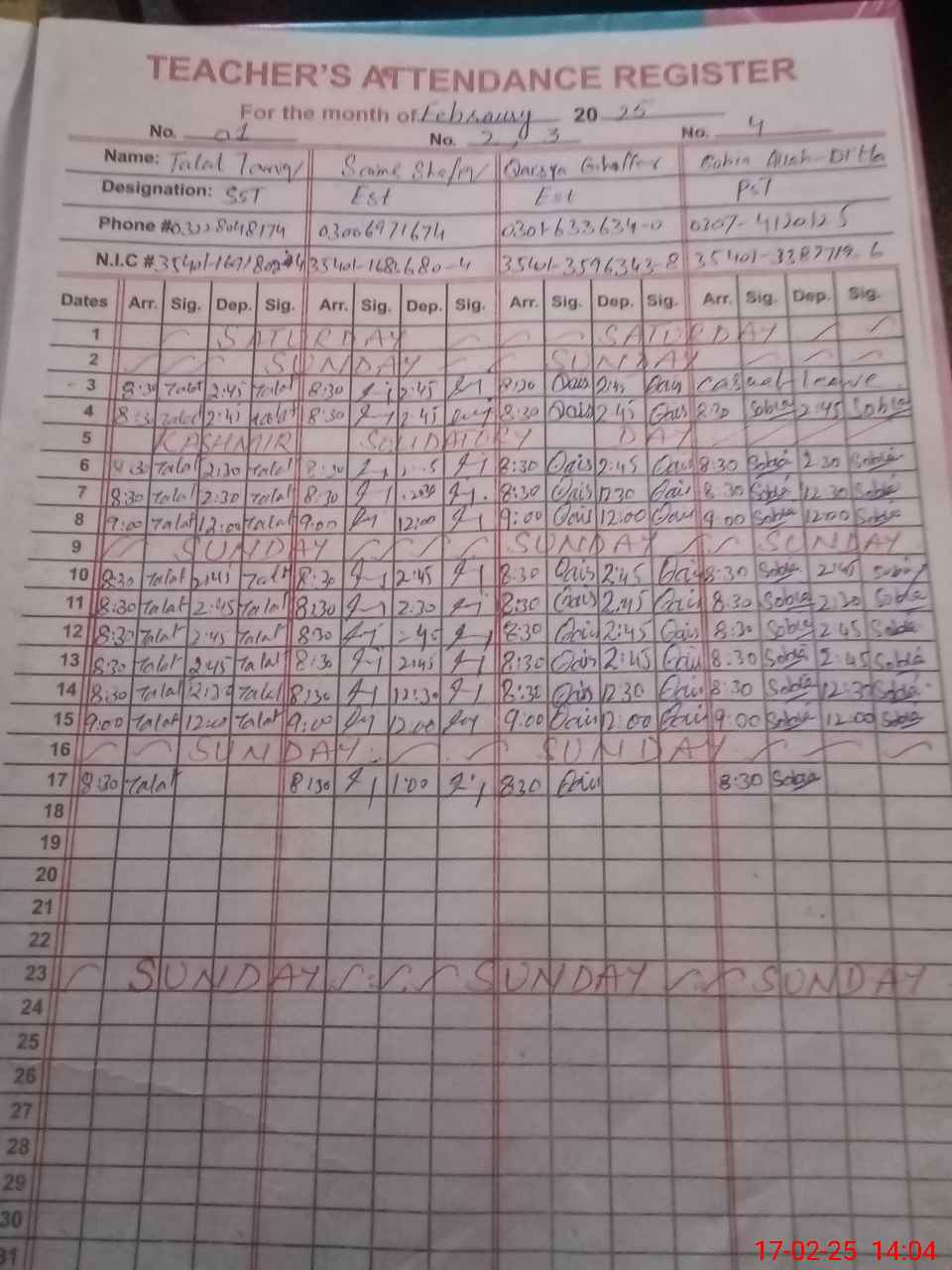 | Name: Ta**** Ta**** Designation: (School Headmaster's/Headmistress's) Sst Sci Phone/Cell Number: 03**** |