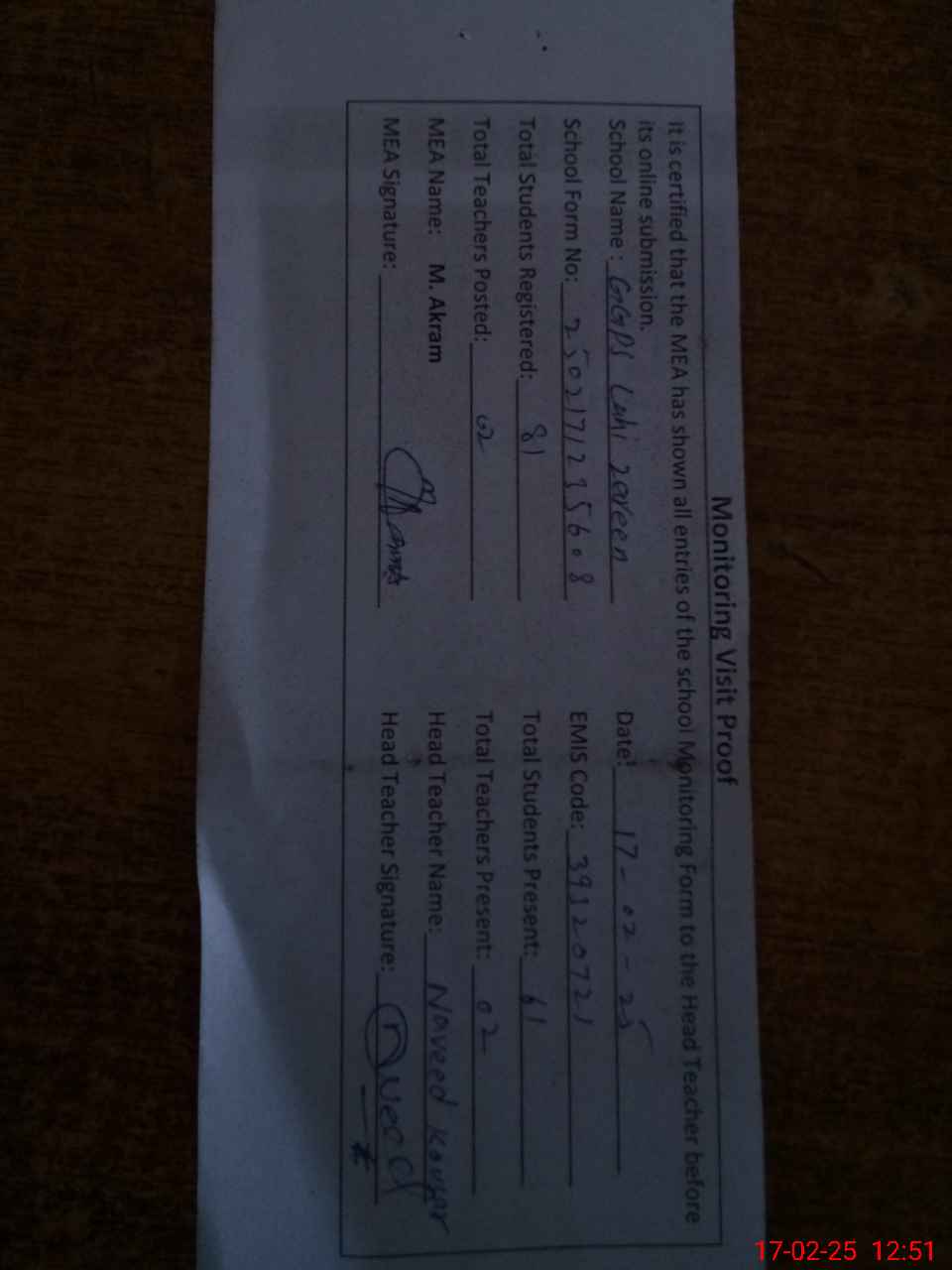 | Attendance Register | Head Teacher | MEA with School | Visit Proof |