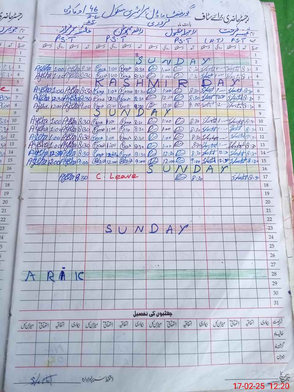 | CNIC | Full Name | Designation | R/C | Absence During Last Calender Month |