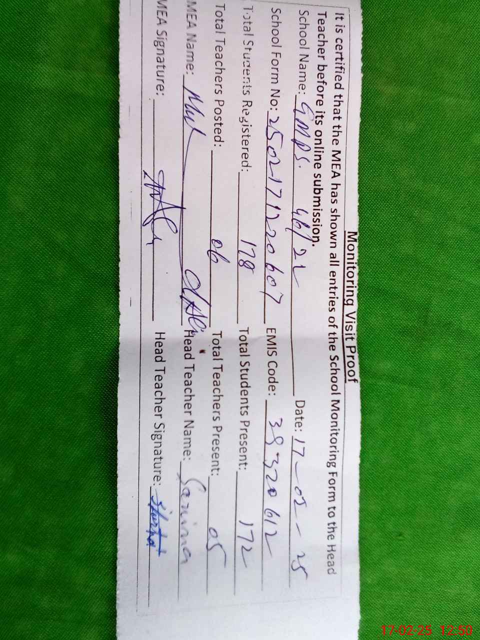 | Attendance Register | Head Teacher | MEA with School | Visit Proof |
