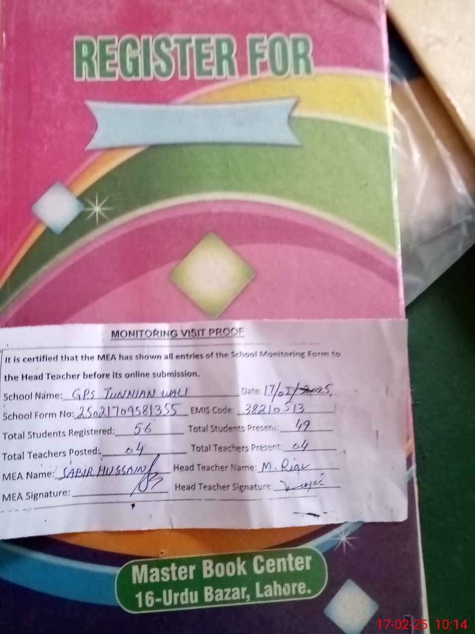 | Attendance Register | Head Teacher | MEA with School | Visit Proof |