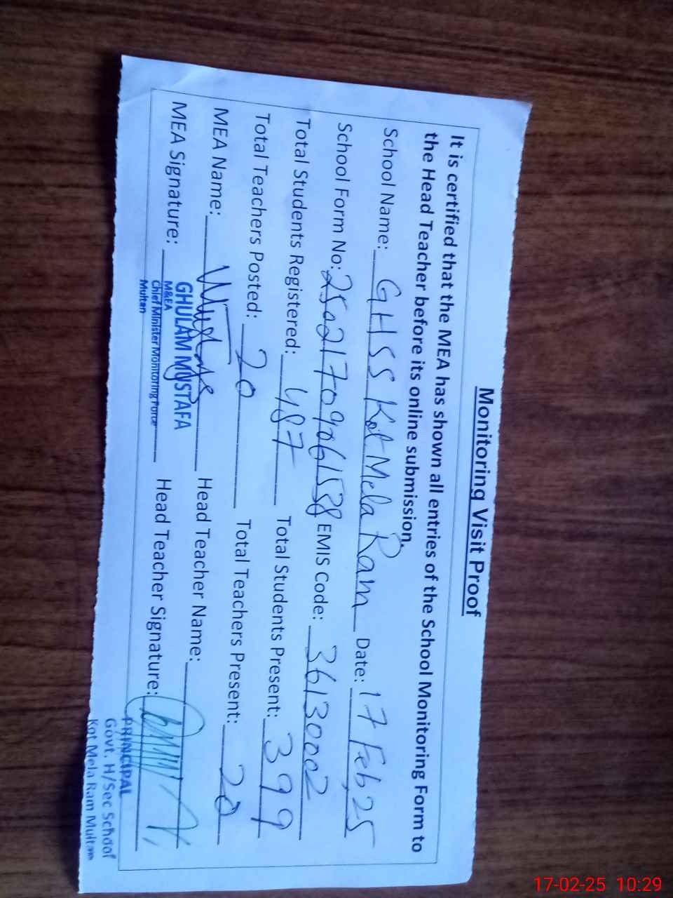 | EMIS Code: 36130002 | Name of School: GHSS KOT MELA RAM RAILWAY STATION MULTAN | |||