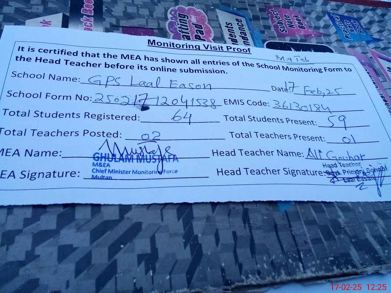 | EMIS Code: 36130184 | Name of School: GPS LAAL EASON BUNGAL WALA SHURQI TEH DISTT | |||