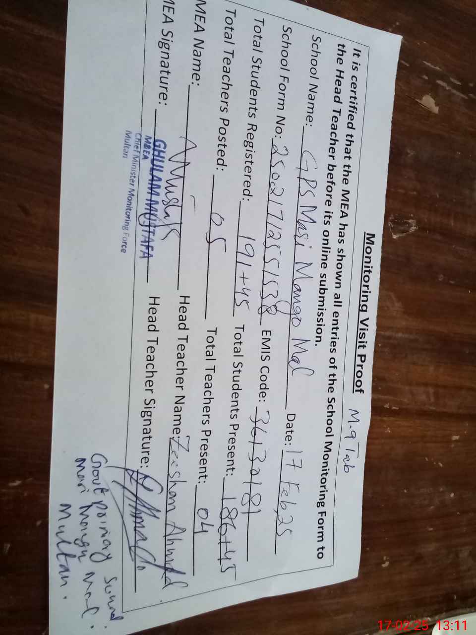 | EMIS Code: 36130181 | Name of School: GPS MARI MANGU MAL BANGAL WALA MULTAN | |||