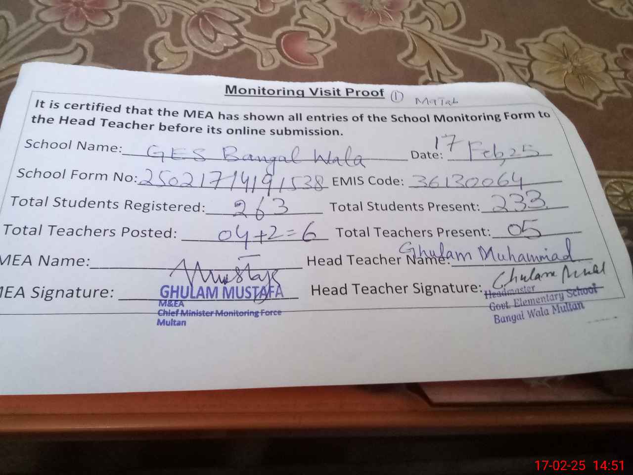| Attendance Register | Head Teacher | MEA with School | Visit Proof |
