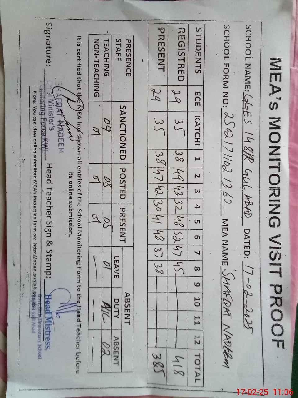 | Attendance Register | Head Teacher | MEA with School | Visit Proof |