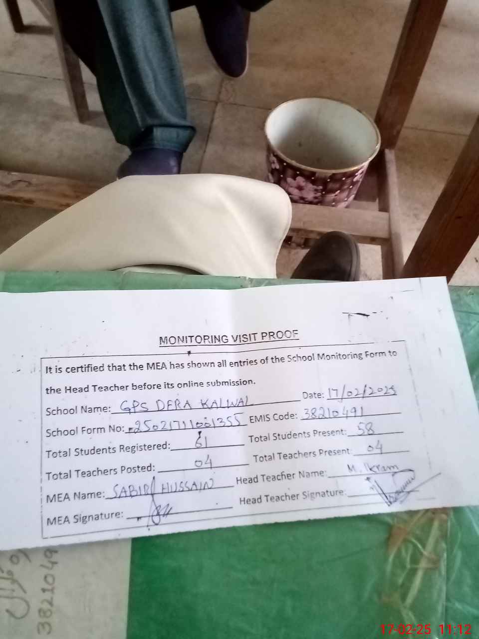 | Attendance Register | Head Teacher | MEA with School | Visit Proof |