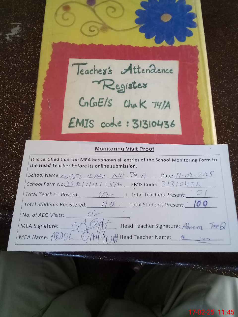 | EMIS Code: 31310436 | Name of School: GGES CHAK NO 74/A | |||