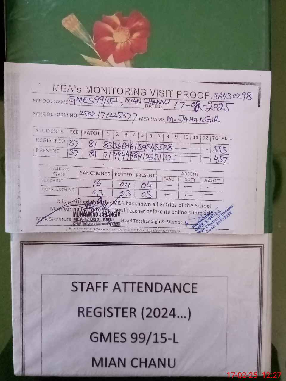 | Attendance Register | Head Teacher | MEA with School | Visit Proof |
