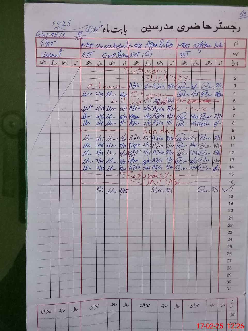 | CNIC | Full Name | Designation | R/C | Absence During Last Calender Month |