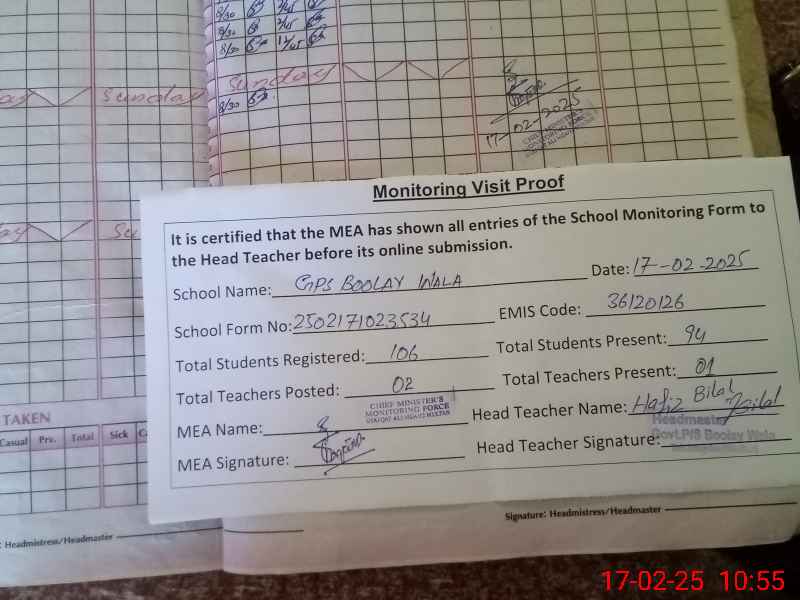 | EMIS Code: 36120126 | Name of School: GPS BOOLAY WALA P/O KOTLI NIJABAT | |||